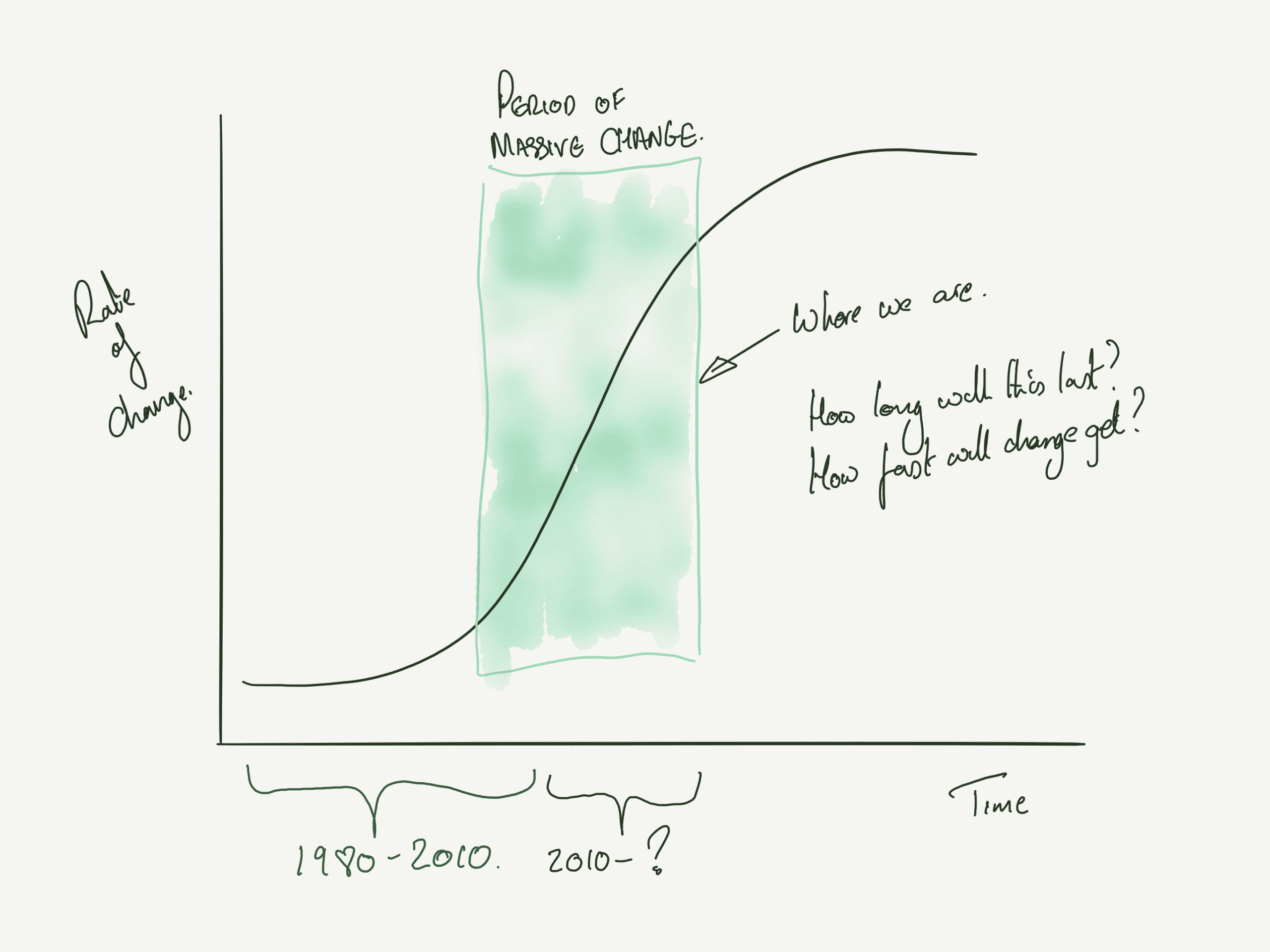It seems likely that we are at the point where the changes are starting to take off. We are entering a period where the rate of change is the fastest. We’ve had 20 – 30 years of developing the innovations that enable the whole scale transformation of human life. Now people are creating the machines that do that.